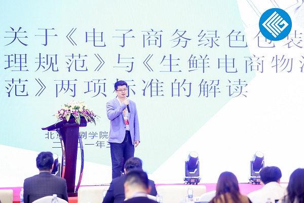 下午的演讲由中国商业联合会商贸物流分会副秘书长杨树林主持,首先是北京印刷学院青岛分院院长朱磊就商贸物流绿色包装领域的两大重要行业标准《电子商务绿色包装技术和管理规范》、《生鲜电商物流包装规范》进行了深入的解读。