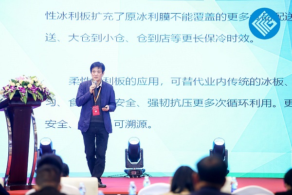 天津冰利蓄冷科技有限公司副总裁张剑文先生主要介绍了自己企业精心研发的产品和服务如何为商贸物流产业提供食品冷链包装的绿色化解决方案。他指出,目前传统的、一般的冰袋都是塑料的,没有做到循环重复使用,冰利蓄冷科技研发的创新型可追溯食品安全冷媒,在配合标准化包装的同时,通过冰利的技术,旨在让我们的地球得到一份绿色。冰利蓄冷科技的初心是希望在保护地球方面尽一份企业责任,所以在设计包装的前期运用了环保和绿色发展方面的理论去考虑,这些都在产品设计中有所展现。