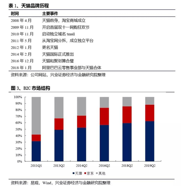 在淘宝力量的支持下,天猫市占率长期位居第一,根据易观数据,2011年第一季度天猫市占率31.4%,领先第二名京东21.2个百分点;2019年第二季度天猫市占率62.4%,领先京东36.8个百分点。