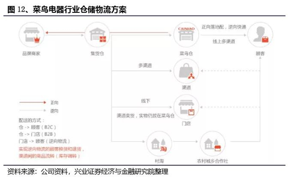 仓配电商模式中前置仓是重点,菜鸟网络可有效提升前置仓运营效率。在仓配电商模式下,阿里电商平台通过设立前置仓外包了传统模式中卖家的物流需求,而支付宝、物流公司和菜鸟网络的职责变化有限,菜鸟网络继续负责物流信息的流转。